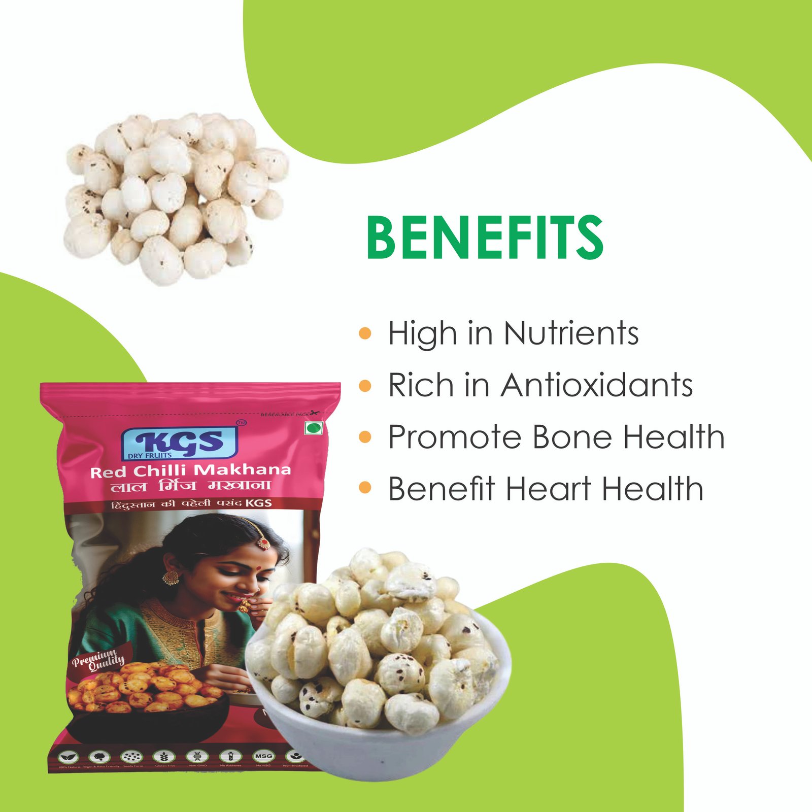 - Makahana Roasted Red Chilly is a robust and tasty snack that combines the blazing heat of red chili with the delicate crunch of makahana seeds.